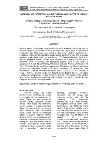 Christian, Wijaya and Joshua, Kurniawan and Rendy, Singgih and Yohanes, Firmansyah and Hendsun, Hendsun (2024) Maternal age, gestation, and parturition as predictor of uterine inertia incidence. MAHESA: Malahayati Health Student Journal, 4 (9): 22. pp. 3905-3917. ISSN 2746-198X