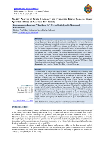 Kusumaningrum, Prasetyani and Luri, Laras Ati and Wawan, Shokib Rondli and Mohammad, Kanzunnudin (2024) Quality analysis of grade 6 literacy and numeracy end-of- semester exam questions based on classical test theory. Jurnal Guru Sekolah Dasar (JGSD), 1 (1): 1. pp. 1-9. ISSN 3063-0169