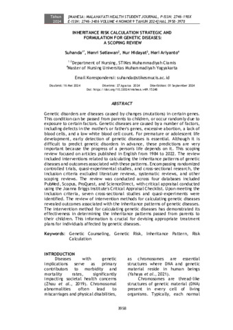 Suhanda, Suhanda and Henri, Setiawan and Nur, Hidayat and Heri, Ariyanto (2024) Inheritance risk calculation strategic and formulation for genetic diseases: A scoping review. MAHESA: Malahayati Health Student Journal, 4 (9): 26. pp. 3958-3978. ISSN 2746-198X