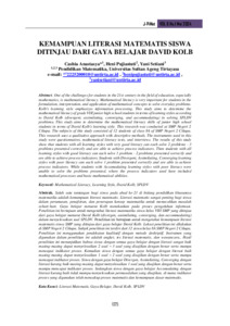 Penelitian ini bertujuan untuk mengetahui kemampuan literasi matematis siswa SMP yang ditinjau dari gaya belajar David Kolb. Lokasi penelitian ini dilakukan di SMP Negeri 2 Cikupa. Subjek penelitian ini terdiri dari 12 siswa kelas 8A SMP Negeri 2 Cikupa.. Penelitian ini menggunakan pendekatan kualitatif dengan metode deskriptif. Instrumen yang digunakan dalam penelitian ini adalah angket, tes literasi matematis, dan wawancara. Siswa menjawab serangkaian soal yang diberikan oleh peneliti. Tes dilakukan untuk mengukur kemampuan literasi matematis, Sedangkan angket dilakukan untuk mengetahui gaya belajar yang dimiliki oleh siswa. Hasil penelitian ini menunjukkan bahwa siswa dengan semua gaya belajar dengan literasi sangat baik masing-masing dapat menyelesaikan 2 soal – 3 soal yang disajikan dengan benar serta mampu mencapai indikator proses. Kemudian siswa dengan semua gaya belajar dengan literasi baik masing-masing dapat menyelesaikan 1 soal – 2 soal yang disajikan dengan benar serta mampu mencapai indikator proses. Siswa dengan gaya belajar Divergen, assimilating , Converging dengan literasi kurang baik masing-masing dapat menyelesaikan 1 soal yang disajikan dengan benar serta mampu mencapai indikator proses. Sedangkan siswa dengan gaya belajar accomodating dengan literasi kurang baik tidak mampu menyelesaikan permasalahan yang disajikan, di mana indikator proses yang digunakan telah mencakup proses matematis dan kemampuan dasar matematis.