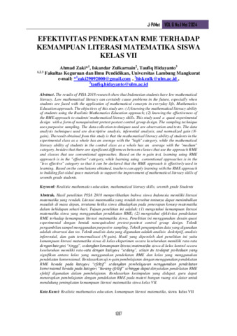 Ahmad, Zaki and Iskandar, Zulkarnain and Taufiq, Hidayanto (2024) Efektivitas pendekatan RME terhadap kemampuan literasi matematika siswa kelas VII. Jurnal Pendidikan Matematika (J-PiMat), 6 (1): 6. pp. 1097-1108. ISSN 2684-7981