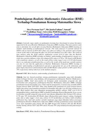 | Uncontrolled Keywords: | RME, Meta-Analisis, Pemahaman konsep matematika, Pembelajaran matematika, Teori pendidikan, Pemecahan masalah |