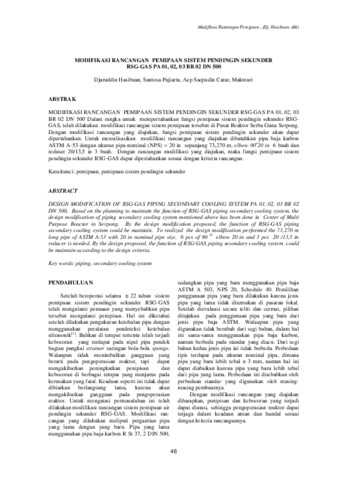 MODIFIKASI RANCANGAN PEMIPAAN SISTEM PENDINGIN SEKUNDER RSG-GAS PA 01, 02, 03 BR 02 DN 500. Dalam rangka untuk mempertahankan fungsi pemipaan sistem pendingin sekunder RSG-GAS, telah dilakukan modifikasi rancangan sistem pemipaan tersebut di Pusat Reaktor Serba Guna Serpong. Dengan modifikasi rancangan yang diajukan, fungsi pemipaan sistem pendingin sekunder akan dapat dipertahankan. Untuk merealisasikan modifikasi rancangan yang diajukan dibutuhkan pipa baja karbon ASTM A-53 dengan ukuran pipa nominal (NPS) = 20 in sepanjang 73,270 m, elbow 90o20 in 6 buah dan reduser 20/13,5 in 3 buah. Dengan rancangan modifikasi yang diajukan, maka fungsi pemipaan sistem pendingin sekunder RSG-GAS dapat dipertahankan sesuai dengan kriteria rancangan.
