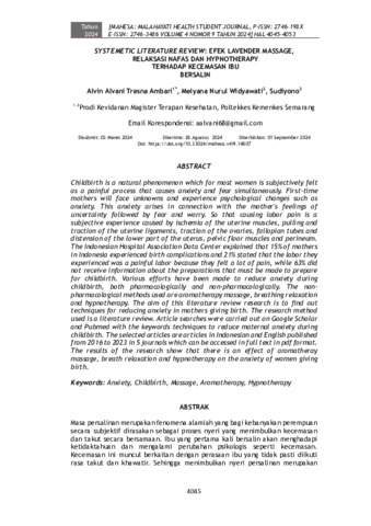 Alvin, Alvani Tresna Ambari and Melyana, Nurul Widyawati and Sudiyono, Sudiyono (2024) Systemetic literature review: Efek lavender massage, relaksasi nafas dan hypnotherapy terhadap kecemasan ibu bersalin. MAHESA: Malahayati Health Student Journal, 4 (9): 33. pp. 4045-4053. ISSN 2746-198X