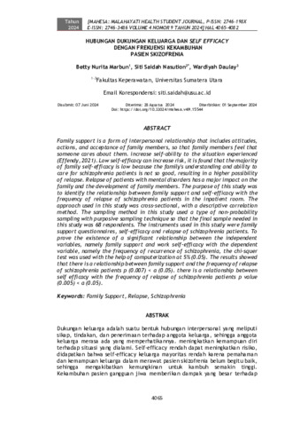 Betty, Nurita Marbun and Siti, Saidah Nasution and Wardiyah, Daulay (2024) Hubungan dukungan keluarga dan self efficacy dengan frekuensi kekambuhan pasien skizofrenia. MAHESA: Malahayati Health Student Journal, 4 (9): 35. pp. 4065-4082. ISSN 2746-198X