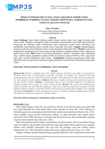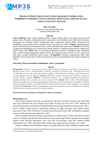 Maya, Triyanita (2024) Tingkat pengetahuan dan angka kejadian cedera pada pemberian warming up dan cooling down pada Athlete Futsal Venus Club Jawa Tengah. Media Physiotherapy Journal of Science (MPJS), 1 (1): 1. pp. 1-4. ISSN 3063-1130