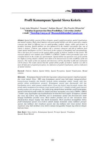 Kemampuan Spasial terdiri dari tiga unsur yaitu persepsi spasial, visualisasi spasial, dan rotasi mental. Siswa SMA yang kemampuan spasial yang baik dapat menggeneralisasi konsep-konsep kompleks dan berpikir berbeda dalam memahami simbol, bentuk, tabel dan gambar dalam pembelajaran geometri. Kemampuan spasial juga dipengaruhi oleh tipe kepribadian siswa, salah satunya adalah koleris. Siswa tipe koleris yang berwatak visioner dan penuh ambisi mempunyai kecerdasan visual-spasial pada level 1 (tingkat terbaik) pada kategori membayangkan dan mengkonsep. Hal inilah yang menjadi dasar penelitian profil kemampuan spasial siswa koleris pada artikel ini. Subjek penelitian merupakan siswa kelas X MIPA 1 SMAN 1 Jember yang digolongkan tipe kepribadiannya berdasarkan hasil angket. Selanjutnya, diambil dua siswa tipe koleris yang diberikan soal tes kemampuan spasial dan diwawancarai untuk menguji kredibilitas jawaban siswa. Hasil analisis jawaban soal tes dan wawancara akan dideskripsikan dengan lengkap lalu ditarik kesimpulan. Hasil penelitian menunjukkan bahwa profil kemampuan spasial siswa koleris adalah mampu memenuhi semua indikator persepsi spasial, dua indikator dari visualisasi spasial, dan dua indikator dari rotasi mental. Sistem organisasi yang baik membuat siswa koleris mampu menggambar bangun tiga dimensi dengan baik dan benar.
