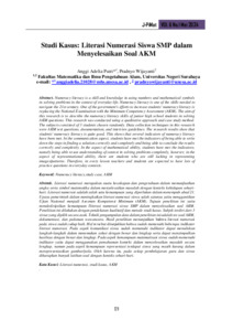 Literasi numerasi merupakan suatu kecakapan dan pengetahuan dalam menggunakan berbagai angka dan simbol matematika dalam menyelesaikan permasalahan kehidupan sehari-hari. Literasi numerasi merupakan salah satu kemampuan yang dibutuhkan pada abad 21. Upaya pemerintah dalam meningkatkan literasi numerasi siswa salah satunya yaitu menggantikan Ujian Nasional menjadi Asesmen Kompetensi Minimum (AKM). Tujuan peneelitian ini yaitu mendeskripsikan kemampuan lliterasi numerasi siswa SMP dalam menyelesaikan soal AKM. Penelitian ini menggunakan pendekatan kualitatif dengan metode studi kasus. Subjek terdiri dari 3 siswa perempuan dan berasal dari sekolah yang sama. Teknik pengumpulan data pada penelitian ini adalah tes soal AKM, dokumentasi, dan pedoman wawancara. Hasil penelitian menunjukkan bahwa kemampuan literasi numerasi pada siswa sudah cukup baik. Hal tersebut ditunjukkan bahwa sudah memenuhi beberapa indikator literasi numerasi. Pada aspek komunikasi siswa sudah memenuhi indikator dapat menuliskan proses dalam mencapai solusi dengan lengkap dan benar serta dapat menyimpulkan hasil matematika dengan lengkap dan benar. Pada aspek kemampuan matematisasi siswa sudah memenuhi indikator yaitu dapat menggunakan pemahaman konteks untuk menyelesaikan masalah matematika dengan lengkap, namun pada aspek kemampuan representasi terdapat siswa yang masih kurang dalam merepresentasikan gambar/pola. Oleh karena itu, pada setiap pembelajaran guru dan siswa diharapkan banyak latihan soal dengan konteks sehari-hari.
