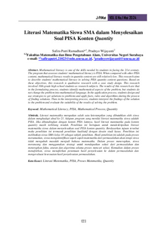 Literasi matematika merupakan salah satu keterampilan yang dibutuhkan oleh siswa dalam menghadapi abad ke-21. Adapun program yang menilai literasi matematika siswa adalah PISA. Jika dibandingkan dengan konten PISA lainnya, hasil literasi matematika pada konten quantity masih terbilang rendah. Penelitian ini bertujuan untuk mendeskripsikan literasi matematika siswa dalam menyelesaikan soal PISA konten quantity. Berdasarkan tujuan tersebut maka penelitian ini termasuk penelitian kualitatif dengan desain studi kasus. Penelitian ini melibatkan siswa SMA kelas 10 sebagai subjek penelitian. Hasil penelitian ini adalah pada proses merumuskan, siswa mengidentifikasi aspek-aspek matematika dari permasalahan akan tetapi siswa tidak mengubah masalah menjadi bahasa matematika. Dalam proses menerapkan, siswa merancang dan menggunakan strategi untuk mendapatkan solusi dari permasalahan dan menerapkan fakta, aturan dan algoritma selama proses mencari solusi. Kemudian dalam proses menafsirkan, siswa menafsirkan penemuan hasil penyelesaian ke dalam permasalahan dan mengevaluasi kesesuaian hasil penyelesaian permasalahan.