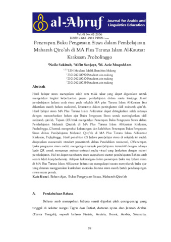 Naila, Sakinah and Alfin, Sanjaya and M. Aziz, Muqoddam (2024) Penerapan buku pengayaan siswa dalam pembelajaran Maharah Qiro’ah di MA Plus Taruna Islam Al-Kautsar Kraksaan Probolinggo. Journal for Arabic and Linguistics (Education Al-Ahruf), 1 (2): 2. pp. 89-109. ISSN 3063-1688