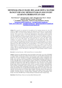 Penelitian ini dilatarbelakangi oleh permasalahan hasil belajar siswa kelas VIII SMPN 10 Satap Ketungau Tengah yang rendah. Penerapan Discovery Learning Model berbantuan LKS merupakan salah satu alternatif penelitian yang digunakan dalam rangka meningkatkan hasil belajar siswa tersebut. Penelitian ini bertujuan mendeskripsikan penerapan, peningkatan hasil belajar siswa, dan respon siswa terhadap Discovery Learning Model berbantuan LKS pada siswa di kelas VIII SMP Negeri 10 Satap Ketungau Tengah. Penelitian ini menggunakan pendekatan deskriptif kualitatif dengan bentuk penelitian tindakan kelas yang terdiri dari dua siklus. Subjek penelitian ini adalah siswa kelas VIII yang berjumlah 36 orang. Instrumen yang digunakan berupa lembar observasi, Lembar Kerja Siswa, soal tes, wawancara, kuesioner, dan dokumentasi. Hasil penelitian menunjukkan bahwa penerapan Discovery Learning Model berbantuan LKS sangat baik sehingga dapat meningkatkan hasil belajar siswa, peningkatan hasil belajar siswa dengan penerapan Discovery Learning Model berbantuan LKS sebesar 15,23 kategori baik sekali yaitu dari rata-rata nilai siswa 65,58 pada siklus I menjadi 80,81 pada siklus II, dan respon siswa terhadap penerapan Discovery Learning Model adalah positif dengan kategori baik Dengan demikian, penerapan Discovery Learning Model berbantuan LKS dapat meningkatkan hasil belajar siswa kelas VIII SMP Negeri 10 Satap Ketungau Tengah pada materi bangun ruang.