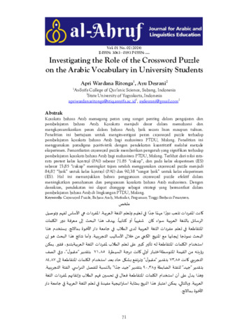 Apri, Wardana Ritonga and Ayu, Desrani (2024) Investigating the role of the crossword puzzle on the Arabic vocabulary in university students. Journal for Arabic and Linguistics Education (Al-Ahruf), 1 (2): 1. pp. 71-88. ISSN 3063-1688