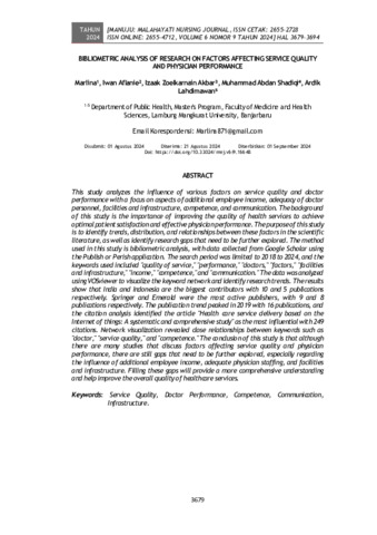 Marlina, Marlina and Iwan, Aflanie and Izaak, Zoelkarnain Akbar and Muhammad, Abdan Shadiqi and Ardik, Lahdimawan (2024) Bibliometric analysis of research on factors affecting service quality and physician performance. Manuju: Malahayati Nursing Journal, 6 (9): 20. pp. 3679-3694. ISSN 2655-2728