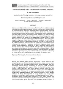 Perawat ICU berbeda dengan perawat bagian lain. Tingkat pekerjaan dan pengetahuan perawat ICU lebih kompleks dibandingkan dengan perawat bagian lain di rumah sakit, sehingga perawat mudah untuk mengalami stres dan berdampak terhadap kinerja. Penelitian ini bertujuan untuk mengetahui pengaruh langsung atau tidak langsung faktor karakteristik individu, faktor intrinsik, faktor ekstrinsik, dan faktor individu terhadap stres kerja dan dampaknya terhadap kinerja perawat di ruang Intensive Care Unit RS Tingkat II Dustira Cimahi. Penelitian ini merupakan penelitian Cross Sectional dengan menggunakan pendekatan analisis jalur. Sampel penelitian ini adalah perawat pelaksana di Ruang ICU berjumlah 31 orang. Analisa data menggunakan pendekatan analisis jalur (Path Analysis). Hasil analisa pada Regresi Model 1 menemukan bahwa variabel faktor Intrinsik (X3) dan faktor Individu (X5) berpengaruh signifikan terhadap stres (Y). Besarnya nilai R2 atau R Square 0.634. Hal ini menunjukkan bahwa kontribusi atau sumbangan pengaruh X3 dan X5 terhadap Y adalah sebesar 63.4%. Pada Regresi Model 2, yakni variabel faktor Intrinsik (X3) dan stres (Y) berpengaruh signifikan terhadap stres (Y). Besarnya nilai R2 atau R Square sebesar 0.429. Hal ini menunjukkan bahwa kontribusi atau sumbangan pengaruh faktor intrinsik (X3) dan stres (Y) terhadap Z adalah sebesar 42.9%. Saran yang peneliti sampaikan sesuai dengan hasil penelitian; penambahan personil perawat pelaksana di Ruang ICU, pendidikan dan pelatihan tentang perawatan pasien kritis, dan menjadikan ICU sebagai salah satu tempat penelitian.