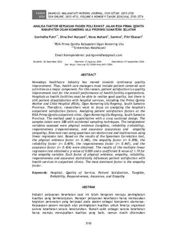 Govindha, Putri and Dina, Dwi Nuryani and Nova, Muhani and Samino, Samino and Fitri, Ekasari (2024) Analisa faktor kepuasan pasien poli rawat jalan RSIA Prima Qonita Kabupaten Ogan Komering Ulu Provinsi Sumatera Selatan. Manuju: Malahayati Nursing Journal, 6 (9): 27. pp. 3765-3776. ISSN 2655-2728
