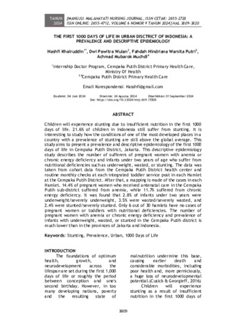 Hashfi, Khairuddin and Dwi, Pawitra Wulan and Fahdah, Hindriana Warsita Putri and Achmad, Mubarok Muchdi (2024) The first 1000 days of life in urban disctrict of Indonesia: A prevalence and descriptive epidemiology. Manuju: Malahayati Nursing Journal, 6 (9): 30. pp. 3809-3820. ISSN 2655-2728