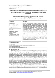 Penelitian ini mengevaluasi pengaruh campuran bahan bakar spiritus dan minyak jelantah terhadap suhu ruang bakar. Tujuannya adalah menemukan alternatif bahan bakar yang ramah lingkungan dan efisien. Metode yang digunakan melibatkan pengukuran suhu pada ruang bakar dengan burner silindris menggunakan termokopel tipe K. Campuran bahan bakar diuji dalam berbagai persentase, mulai dari 100% spiritus hingga 80% minyak jelantah. Hasil menunjukkan bahwa peningkatan persentase minyak jelantah meningkatkan densitas dan viskositas campuran tetapi menurunkan suhu ruang bakar. Suhu tertinggi (98°C) dicapai dengan spiritus murni, sedangkan suhu terendah (42°C) dicapai dengan campuran 20% spiritus dan 80% minyak jelantah. Penelitian ini menyimpulkan bahwa campuran spiritus dan minyak jelantah memiliki potensi sebagai bahan bakar alternatif, meskipun diperlukan optimasi lebih lanjut untuk meningkatkan efisiensi pembakaran.