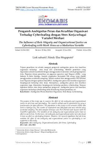 Lieli, Suharti and Nindy, Elsa Megaputri (2023) Pengaruh ambiguitas peran dan keadilan organisasi terhadap cyberloafing dengan stres kerja sebagai variabel mediasi. Jurnal Ekonomi Manajemen Bisnis (EKOMABIS), 4 (2): 5. pp. 155-170. ISSN 2716-0238