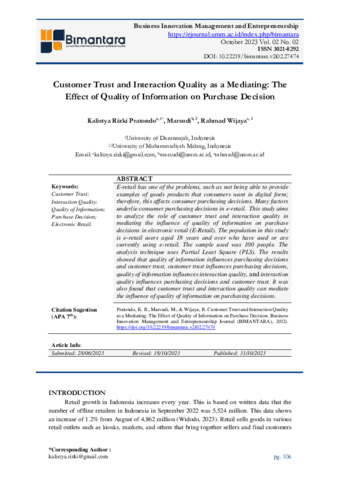 Kalistya, Rizki Pratondo and Marsudi, Marsudi and Rahmad, Wijaya (2023) Customer Trust and Interaction Quality as a Mediating: The Effect of Quality of Information on Purchase Decision. Business Innovation Management and Entrepreneurship, 2 (2): 3. pp. 106-121. ISSN 3021-8292