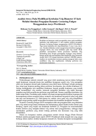 Beltsazar, Joy Panggabean and Adhes, Gamayel and Ida, Bagus and M.U.Z., Priyadi (2024) Analisis stress pada modifikasi ketebalan velg diameter 15 inch melalui simulasi pengujian dynamic cornering fatigue menggunakan ansys workbench. Integrated Mechanical Engineering Journal (IMEJOUR), 2 (1): 4. pp. 28-34. ISSN 3026-7579