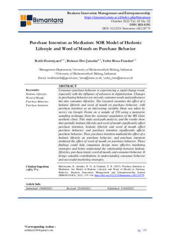 Ratih, Haristiyanti and Rohmat, Dwi Jatmiko and Yulist, Rima Fiandari (2023) Purchase intention as mediation: SOR model of hedonic lifestyle and word of mouth on purchase behavior. Business Innovation Management and Entrepreneurship, 2 (2): 5. pp. 135-148. ISSN 3021-8292