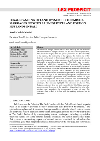 Aurellia, Valeda Mirabel (2024) Legal standing of land ownership for mixed marriages between balinese wives and foreign husbands in Bali. LEX PROSPICIT, 2 (1): 1. pp. 1-18. ISSN 2988-1781