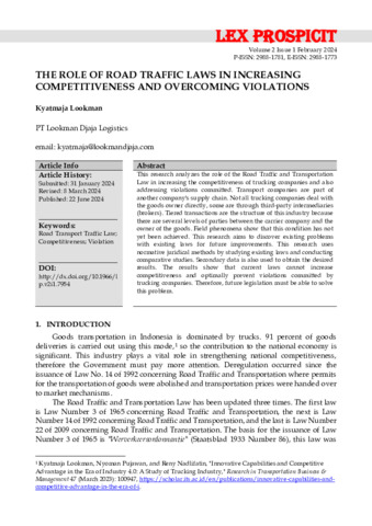 Kyatmaja, Lookman (2024) The role of road traffic laws in increasing competitiveness and overcoming violations. LEX PROSPICIT, 2 (1): 2. pp. 19-31. ISSN 2988-1781