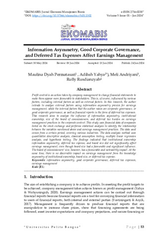 Maulina, Dyah Permatasari and Adibah, Yahya and Meli, Andriyani and Rully, Rusdianzyah (2024) Information asymmetry, good corporate governance, and deferred tax expenses affect earnings management. Jurnal Ekonomi Manajemen Bisnis (EKOMABIS), 5 (1): 5. pp. 53-68. ISSN 2716-0238