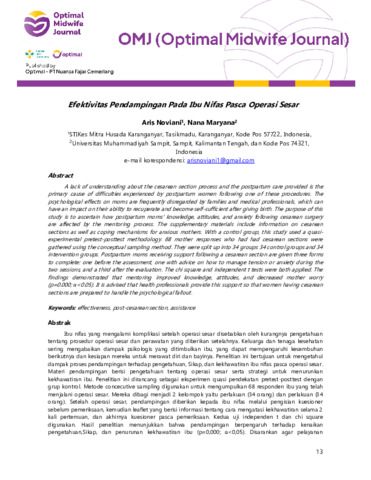 Aris, Noviani and Nana, Maryana (2024) Efektivitas pendampingan pada ibu nifas pasca operasi sesar. Optimal Midwife Journal (OMJ), 1 (1): 2. pp. 13-21. ISSN 3062-6765