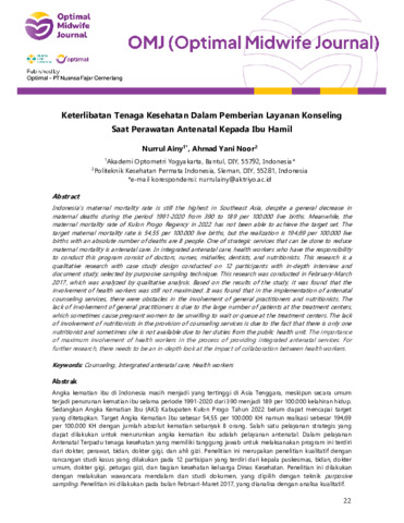 Nurrul, Ainy and Ahmad, Yani Noor (2024) Keterlibatan tenaga kesehatan dalam pemberian layanan konseling saat perawatan antenatal kepada ibu hamil. Optimal Midwife Journal (OMJ), 1 (1): 3. pp. 22-31. ISSN 3062-6765