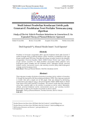 Dedi, Supriadi and Ahmad, Haidir Iman and Yudi, Saputra (2024) Studi intensi pembelian kendaraan listrik pada Generasi-Z: Pendekatan teori perilaku terencana yang diperluas. Jurnal Ekonomi Manajemen Bisnis (EKOMABIS), 5 (1): 7. pp. 83-98. ISSN 2716-0238