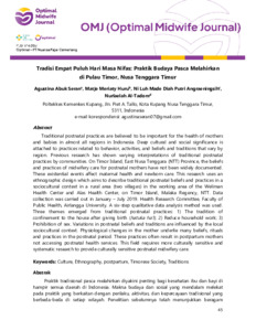 Agustina, Abuk Seran and Matje, Meriaty Huru and Ni, Luh Made Diah Putri AngraeningsihNi Luh Made Diah Putri Angra and Nurlaelah, Al-Tadom (2024) Tradisi empat puluh hari masa nifas: praktik budaya pasca melahirkan di pulau timor, nusa tenggara timur. Optimal Midwife Journal (OMJ), 1 (1): 5. pp. 46-58. ISSN 3062-6765