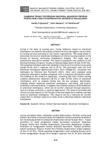 Gendis, Fujiyastuti and Indra, Maulana and Sri, Hendrawati (2024) Gambaran tingkat kecerdasan emosional mahasiswa Program Profesi Ners Fakultas Keperawatan Universitas Padjadjaran. Manuju: Malahayati Nursing Journal, 6 (9): 35. pp. 3868-3884. ISSN 2655-2728