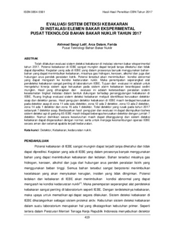 Telah dilakukan evaluasi sistem deteksi kebakaran di instalasi elemen bakar eksperimental tahun 2017. Potensi kebakaran di IEBE sangat mungkin dapat terjadi tanpa diketahui dan tidak dapat diprediksi. Kegiatan yang ada di IEBE yang dalam prosesnya banyak menggunakan bahan-bahan yang dapat menimbulkan kebakaran, misalnya gas hidrogen, kerosen, alkohol dan juga dari hubungan arus pendek peralatan listrik. Potensi tersebut akan menimbulkan kondisi abnormal yang dapat mengarah ke kondisi kedaruratan nuklir. Maka penempatan seperangkat alat pendeteksi kebakaran sangat penting di laboratorium IEBE. Tujuan dari evaluasi ini adalah untuk mengetahui kinerja sistem agar kerusakan pada sistem alarm kebakaran terantisipasi sedini mungkin. Hasil yang diharapkan dari evaluasi ini adalah ketersediaan peralatan sistem keselamatan tingkat instalasi dalam bentuk dukungan terhadap penanggulangan kebakaran di IEBE. Ruang lingkup evaluasi sistem deteksi kebakaran meliputi identifikasi kerusakan detektor asap dan detektor panas. Hasil pengujian detektor kebakaran di IEBE masih terdapat kerusakan pada detektor asap di zona 11 ada satu detektor, zona 12 ada 2 detektor, zona 13 ada 2 detektor, zona 14 ada 1 detektor dan zona 15 ada 1 detektor. Total detektor yang rusak pada tahun 2017 sebanyak 7 detektor asap. Berdasarkan hasil pengujian dan evaluasi ini dapat disimpulkan bahwa sistem deteksi api di gedung 65 IEBE masih trdapat beberapa kerusakan detektor dengan jumlah 7 detektor. Namun demikian secara keseluruhan masih dapat ditanggulangi dan sistem deteksi kebakaran dapat dioperasikan dengan normal. serta untuk menjaga kesinambungan operasi IEBE secara aman dan selamat apabila terjadi kedaruratan.
