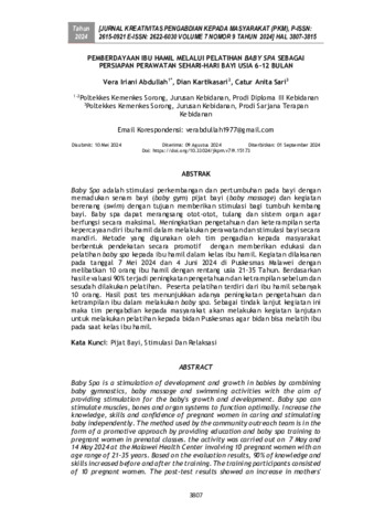 Vera, Iriani Abdullah and Dian, Kartikasari and Catur, Anita Sari (2024) Pemberdayaan ibu hamil melalui pelatihan baby spa sebagai persiapan perawatan sehari-hari bayi usia 6-12 bulan. Jurnal Kreativitas Pengabdian kepada Masyarakat, 7 (9): 5. pp. 3807-3815. ISSN 2615-0921