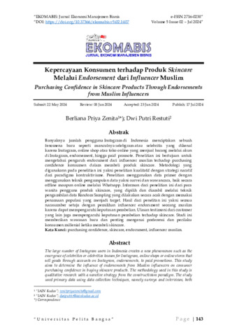 Berliana, Priya Zenita and Dwi, Putri Restuti (2024) Kepercayaan konsumen terhadap produk skincare melalui endorsement dari influencer muslim. Jurnal Ekonomi Manajemen Bisnis (EKOMABIS), 5 (2): 2. pp. 143-160. ISSN 2716-0238