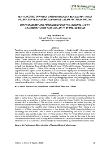 Tedy, Hendrisman (2024) Pertanggung jawaban dan pemidanaan terhadap tindak pidana penyebaran data pribadi dalam pinjaman online. Jurnal Penelitian Hukum Galunggung (JPH Galunggung), 1 (2): 1. pp. 1-10. ISSN 3046-6903