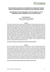 Penelitian yang penulis lakukan dengan judul pemidanaan terhadap tindak pidana penyebaran data pribadi dalam pinjaman online. Adapun permasalahan yang diambil dalam penelitian ini adalah bagaimana ketentuan tindak pidana penyebaran data pribadi dalam pinjaman online dan bagaimana pertanggungjawaban pidana terhadap penyebaran data pribadi dalam pinjaman online. Tujuan penelitian ini untuk untuk mengetahui ketentuan pemidanaan terhadap tindak pidana penyebaran data pribadi dalam pinjaman online. Hal ini guna mendapatkan gambaran secara pasti mengenai peraturan pemidanaan yang mengatur masalah terhadap penyebaran data pribadi yang berkaitan dengan Undang-Undang Nomor 19 Tahun 2016 tentang Perubahan Atas Undang-Undang Nomor 11 Tahun 2008 tentang Informasi Teknologi dan Elektronik. Serta agar dapat memberikan pemahaman dan kepercayaan dalam transaksi pinjaman online untuk berhati-hati dalam memberikan data pribadinya. Hasil penelitian menunjukan bahwa penyedia dalam layanan digital untuk terjaminnya suatu perlindungan dapat berpotensi penyalahgunaan jika adanya akibat yang seharusnya dapat dimintai pertanggungjawaban dan pertanggungjawaban pidana terhadap penyebaran data pribadi dalam pinjaman online pemidanaan terhadap penyebaran data pribadi terhadap pinjaman online.
