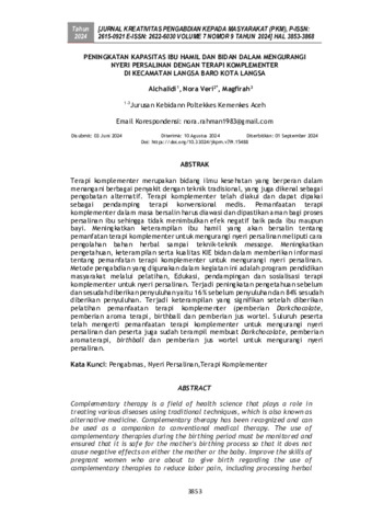 Alchalidi , ,, Alchalidi and Nora, Veri and Magfirah, Magfirah (2024) Peningkatan kapasitas ibu hamil dan bidan dalam mengurangi nyeri persalinan dengan terapi komplementer di Kecamatan Langsa Baro Kota Langsa. Jurnal Kreativitas Pengabdian kepada Masyarakat, 7 (9): 9. pp. 3853-3868. ISSN 2615-0921