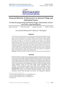 Auwalin, Siti Maisyaroh and Riawan, Riawan and Titi, Rapini (2024) Financial behavior of housewives in selosari village and influential factors. Jurnal Ekonomi Manajemen Bisnis (EKOMABIS), 5 (2): 9. pp. 251-262. ISSN 2716-0238