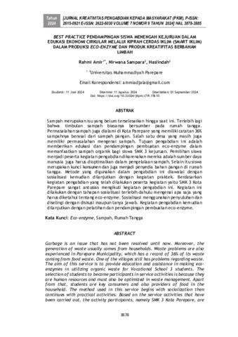 Rahmi, Amir and Nirwana, Sampara and Haslindah, Haslindah (2024) Best practice pendampingan siswa menengah kejuruan dalam edukasi ekonomi cirkular melalui kiprah cerdas iklim (smart iklim) dalam produksi eco-enzyme dan produk kreatifitas berbahan limbah. Jurnal Kreativitas Pengabdian kepada Masyarakat, 7 (9): 11. pp. 3878-3885. ISSN 2615-0921
