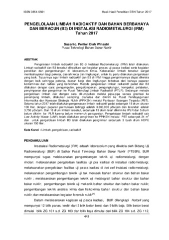 Susanto, Susanto and Winastri, Pertiwi Diah (2018) PENGELOLAAN LlMBAH RADIOAKTIF DAN BAHAN BERBAHAYA DAN BERACUN (B3) DI INSTALASI RADIOMETALURGI (IRM) Tahun 2017. Prosiding Seminar Hasil-hasil Penelitian EBN Tahun 2017, - (-). pp. 443-451. ISSN 0854-5561