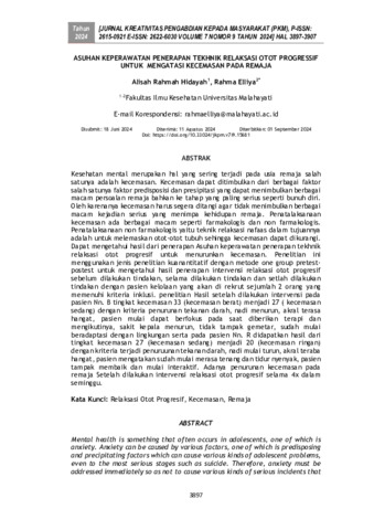 Alisah, Rahmah Hidayah and Rahma, Elliya and Ida, Ria Royentina Sidabukke (2024) Asuhan keperawatan penerapan tekhnik relaksasi otot progressif untuk mengatasi kecemasan pada remaja. Jurnal Kreativitas Pengabdian kepada Masyarakat, 7 (9): 13. pp. 3897-3907. ISSN 2615-0921