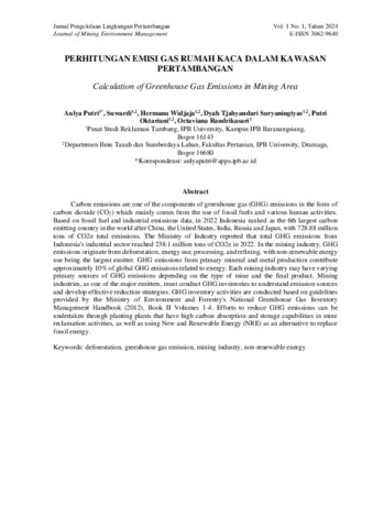 Aulya, Putri and Suwardi, Suwardi and Hermanu, Widjaja and Dyah, Tjahyandari Suryaningtyas and Putri, Oktariani and Octaviana, Randrikasari (2024) Perhitungan emisi gas rumah kaca dalam kawasan pertambangan. Jurnal Pengelolaan Lingkungan Pertambangan (JPLP), 1 (1): 3. pp. 21-28. ISSN 3062-9640