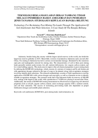 Suwardi, Suwardi and Octaviana, Randrikasari (2024) Teknologi reklamasi lahan bekas tambang timah melalui pemberian bahan amelioran dan pemilihan jenis tanaman: studi kasus Kepulauan Bangka Belitung. Jurnal Pengelolaan Lingkungan Pertambangan (JPLP), 1 (1): 4. pp. 29-43. ISSN 3062-9640