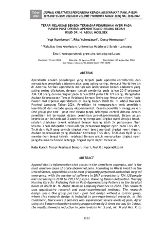 Yogi, Kurniawan and Rika, Yulendasari and Dessy, Hermawan (2024) Terapi relaksasi benson terhadap penurunan nyeri pada pasien post operasi apendiktomi di ruang bedah RSUD Dr. H. Abdul Moeloek. Jurnal Kreativitas Pengabdian kepada Masyarakat, 7 (9): 16. pp. 3932-3944. ISSN 2615-0921