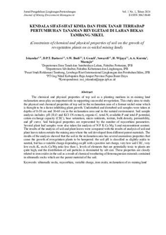 Iskandar, Iskandar and D., P.T. Baskoro and S., W. Budi and I., Gozali and Suwardi, Suwardi and H., Wijaya and A., A. Kurnia (2024) Kendala sifat-sifat kimia dan fisik tanah terhadap pertumbuhan revegetasi di lahan bekas tambang nikel. Jurnal Pengelolaan Lingkungan Pertambangan (JPLP), 1 (1): 6. pp. 55-66. ISSN 3062-9640
