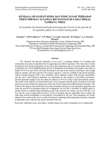 The chemical and physical properties of top soil as a planting medium in ex-mining land reclamation areas play an important role in supporting successful revegetation. This study aims to study the physical and chemical properties of top soil in the reclamation area of a former nickel mine which is thought to be a factor inhibiting plant growth. Undisturbed and disturbed soil samples were taken at depths of 0-30 cm and 30-60 cm in the reclamation area and in the natural environment. Soil sample analysis includes: pH (H2O and KCl 1N extract), organic-C, total-N, available-P and total-P potential, cation exchange capacity (CEC), base saturation, micro nutrients, texture, bulk density, permeability, and pF curve. Soil biological properties are represented by the number of mycorrhiza parameters. Several plant leaf samples were also taken for analysis of N P K Ca Mg S and micronutrient content. The results of the analysis of soil and plant leaves were compared with the results of analysis of soil and plant leaves taken outside the mining area where the soil developed from different parent materials. The results of the analysis showed that the soil in the reclamation area has several anomalous properties that cause the growth of revegetation plants to be hampered: the soil pH is classified as slightly acidic to neutral, but has a variable charge depending on pH with a positive net charge, very low soil CEC, very low exch.-K, exch.-Ca/Mg ratio less than 1, levels of elements that are potentially toxic to plants are quite high, and the distribution of soil particles is dominated by silt size. These properties are closely related to iron oxides in the soil as a result of chemical weathering of ferromagnesian minerals contained in ultramafic rocks which are the parent material of the soil.