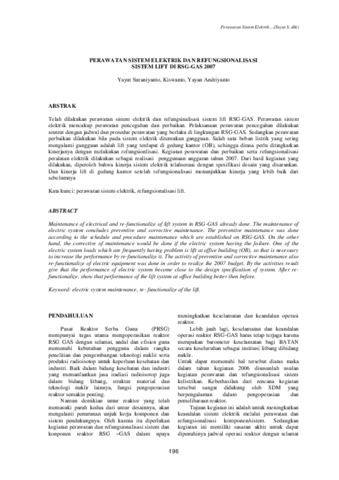 Telah dilakukan perawatan sistem elektrik dan refungsinalisasi sistem lift RSG-GAS. Perawatan sistem elektrik mencakup perawatan pencegahan dan perbaikan. Pelaksanaan perawatan pencegahan dilakukan seutrut dengan jadwal dan prosedur perawatan yang berlaku di lingkungan RSG-GAS. Sedangkan perawatan perbaikan dilakukan bila pada sistem elektrik ditemukan gangguan. Salah satu beban listrik yang sering mengalami gangguan adalah lift yang terdapat di gedung kantor (OB), sehingga dirasa perlu ditingkatkan kinerjanya dengan melakukan refungsionlisasi. Kegiatan perawatan dan perbaikan serta refungsionalisasi peralatan elektrik dilakukan sebagai realisasi penggunaan anggaran tahun 2007. Dari hasil kegiatan yang dilakukan, diperoleh bahwa kinerja sistem elektrik telahsesuai dengan spesifikasi desain yang disarankan. Dan kinerja lift di gedung kantor setelah refungsionalisasi menunjukkan kinerja yang lebih baik dari sebelumnya