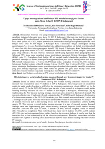 Berdasarkan observasi awal yang menunjukkan rendahnya hasil belajar siswa, maka dilakukan penelitian tindakan kelas pada siswa kelas IV SDN 2 Kalangsari. Nilai rata-rata hasil tes siswa pada pembelajaran IPS masih dibawah kriteria ketuntasan minimal (KKM) yang ditetapkan sekolah yaitu 75. Pada tahun ajaran 2022–2023, tujuan penelitian ini adalah untuk meningkatkan pembelajaran IPS. hasil belajar siswa kelas IV SD Negeri 2 Kalangsari Kota Tasikmalaya dengan menerapkan strategi pembelajaran Peer Lessons. Penelitian tindakan kelas adalah jenis penelitian ini. Subjek penelitian adalah 12 siswa laki-laki dan 6 siswa perempuan kelas IV SD Negeri 2 Kalangsari Kota Tasikmalaya pada semester genap tahun ajaran 2022–2023. Penelitian ini dilaksanakan dalam 2 siklus, dengan 2 pertemuan pada setiap siklusnya. Tes dan observasi merupakan metode yang digunakan dalam pengumpulan data. Sebanyak 75% siswa yang mengikuti proses pembelajaran memenuhi Kriteria Ketuntasan Minimal (KKM) yaitu 75. Peningkatan hasil belajar IPS ini menjadi tanda keberhasilan penelitian. Temuan penelitian menunjukkan bahwa penerapan strategi pembelajaran peer lessons meningkatkan hasil belajar IPS. Setelah tindakan siklus I, 7 siswa (38,89%) tidak tuntas, sedangkan 11 siswa (61,11%) mencapai ketuntasan. Setelah kegiatan siklus II, terdapat 3 siswa (16,67%) dan 15 siswa (83,33%) yang belum tuntas belajarnya. Berdasarkan temuan penelitian, dapat dikatakan bahwa peneliti memiliki pemahaman yang jelas tentang lingkungan kelas. Oleh karena itu, peneliti dan guru kelas bekerja sama untuk menyusun rencana tindakan yang dapat meningkatkan hasil belajar IPS siswa kelas IV.